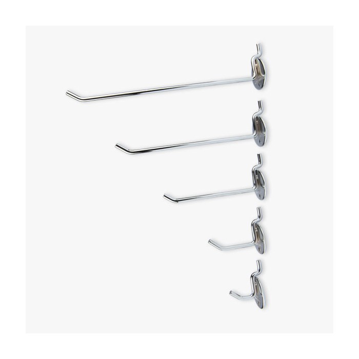 크롬 도금된 금속타공판 전용 후크입니다. 5가지의 후크를 용도에 맞게 걸어서 사용하실 수 있습니다. 주문시 사이즈를 확인하시기 바랍니다. (표시된 사이즈는 후크의 원형부분에서 돌출된 길이 입니다.)