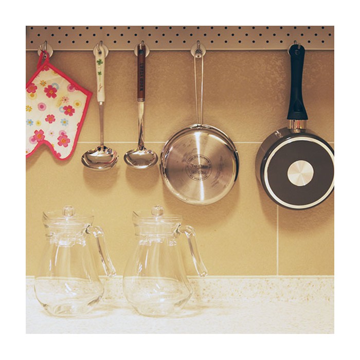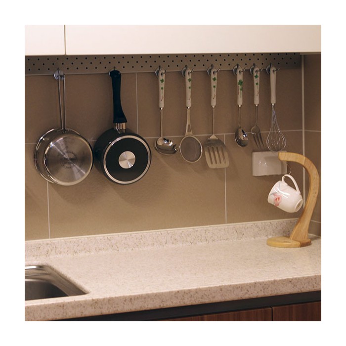 녹방지를 겸비한 1.2T 스텐인리스 재질의 타공판 입니다. 주방 싱크상부장에 피스(나사)로 고정하는 방식으로 설치가 간단합니다. 금속 타공판후크(선택옵션/별매품)를 이용해 편리하게 사용할 수 있습니다.